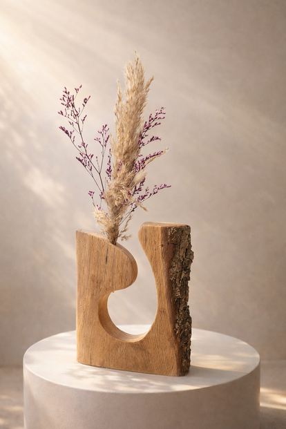 Vase décoratif artisanal en bois naturel, au design sculptural et organique. Son contraste entre surface lisse et bois brut en fait une pièce unique, parfaite pour sublimer des fleurs séchées et apporter une touche naturelle et authentique à votre intérieur.